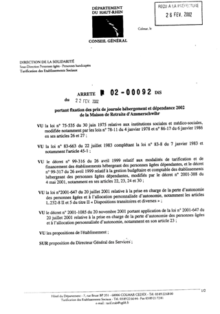 Portant fixation des prix de journée hébergement et dépendance 2002 de la maison de retraite d'AMMERSCHWIHR Resumé Pièces jointes ARRETE Assemblée : Non défini Date : 22/02/2002 Rapporteur : Non défini Collectivité : Conseil départemental du Haut-Rhin Direction : Non défini Service : Service de la Tarification des Etablissements Domaine : Prix de Journée Commission :