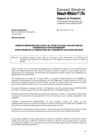 Le présent rapport a pour objet le versement d’une subvention de 346663 € à LOGIEST pour financer la démolition de 100 logements locatifs sociaux à SAINT-LOUIS.