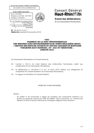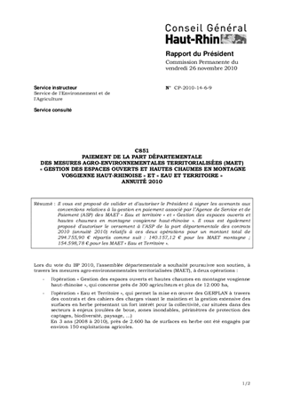 C851 PAIEMENT DE LA PART DÉPARTEMENTALE DES MESURES AGRO-ENVIRONNEMENTALES TERRITORIALISÉES (MAET) « GESTION DES ESPACES OUVERTS ET HAUTES CHAUMES EN MONTAGNE VOSGIENNE HAUT-RHINOISE » ET « EAU ET TERRITOIRE » ANNUITÉ 2010