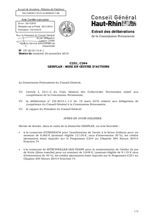 Dans le cadre du GERPLAN des communautés de communes de la Vallée Noble et du Pays de Thann, le Département est sollicité pour : - l’amélioration d’un accès à une ferme à Osenbach, - la modernisation de l’atelier de jus de fruits de Bitschwiller-les-Thann, - l’acquisition de distributeurs automatiques de produits fermiers à Aspach-le-Bas. Il vous est proposé de financer ces demandes pour un montant total de 12.959€.