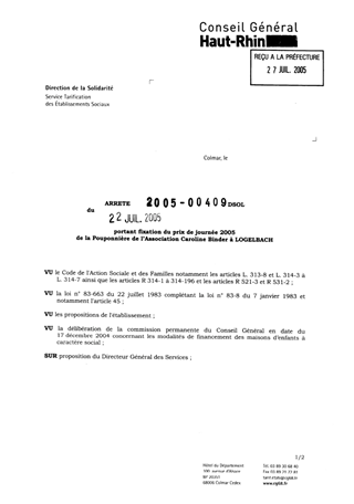 portant fixation du prix de journée 2005 de la pouponnière de l'association Caroline Binder à LOGELBACH. Resumé Pièces jointes ARRETE Assemblée : Non défini Date : 22/07/2005 Rapporteur : Non défini Collectivité : Conseil départemental du Haut-Rhin Direction : Non défini Service : Service de la Tarification des Etablissements Domaine : Organisation Interne Commission :