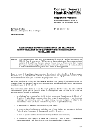 Le présent rapport a pour objet de proposer l’affectation de crédits d’un montant de 402 190 € sur le programme F244 en faveur du syndicat mixte d’aménagement des stations de la vallée de Munster Hautes Vosges pour le financement d’un réseau d’enneigement automatique s’inscrivant dans le cadre de travaux de restructuration et de modernisation des équipements de loisirs du Schnepfenried.