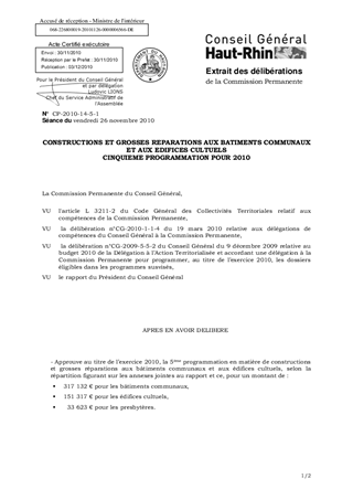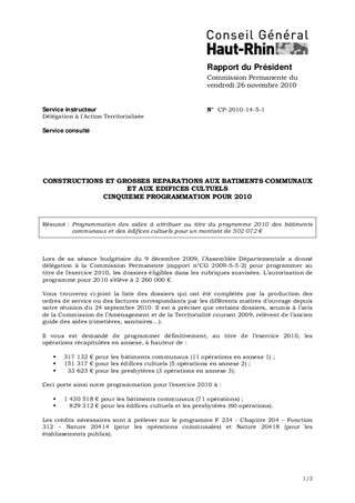 CONSTRUCTIONS ET GROSSES REPARATIONS AUX BATIMENTS COMMUNAUX ET AUX EDIFICES CULTUELS CINQUIEME PROGRAMMATION POUR 2010