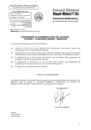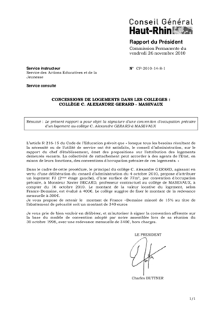 Le présent rapport a pour objet la signature d'une convention d'occupation précaire d'un logement au collège C. Alexandre GERARD à MASEVAUX