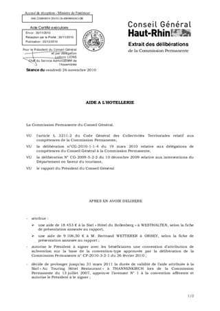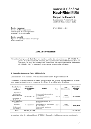 Il est proposé d'attribuer un montant global de subventions de 27 559,50 € en faveur de 2 établissements hôteliers, prolonger la durée de validité de la subvention attribuée à la Sàrl "Au Touring Hôtel Restaurant" lors de la Commission Permanente du 13 juillet 2007 et approuver un avenant à la convention afférente.