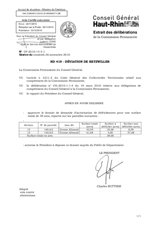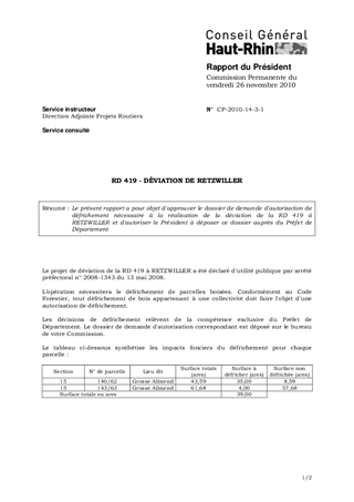 Le présent rapport a pour objet d'approuver le dossier de demande d'autorisation de défrichement nécessaire à la réalisation de la déviation de la RD 419 à RETZWILLER et d'autoriser le Président à déposer ce dossier auprès du Préfet de Département