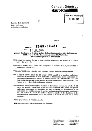 portant fixation de la dotation globale de fonctionnement au titre de l'exercice 2005 pour le service d'accompagnement à la vie sociale du centre hospitalier de MULHOUSE. Resumé Pièces jointes ARRETE Assemblée : Non défini Date : 26/07/2005 Rapporteur : Non défini Collectivité : Conseil départemental du Haut-Rhin Direction : Non défini Service : Service de la Tarification des Etablissements Domaine : Dotations financières Commission :