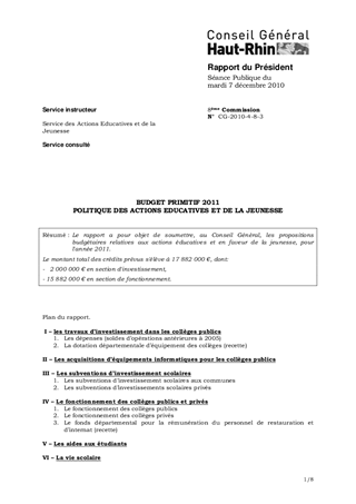 Le rapport a pour objet de soumettre, au Conseil Général, les propositions budgétaires relatives aux actions éducatives et en faveur de la jeunesse, pour l'année 2011. Le montant total des crédits prévus s'élève à 17 882 000 €, dont: - 2 000 000 € en section d'investissement, - 15 882 000 € en section de fonctionnement.