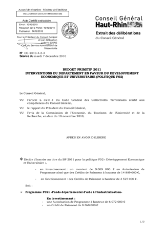 BUDGET PRIMITIF 2011 INTERVENTIONS DU DEPARTEMENT EN FAVEUR DU DEVELOPPEMENT ECONOMIQUE ET UNIVERSITAIRE (POLITIQUE F02)