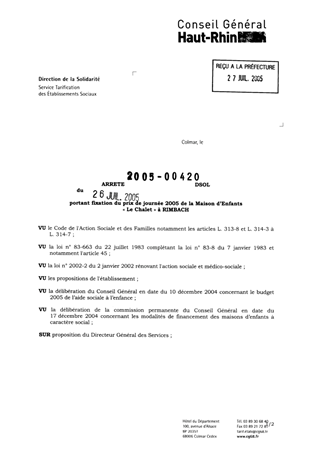 portant fixation du prix de journée 2005 de la maison d'enfants "Le Chalet" à RIMBACH. Resumé Pièces jointes ARRETE Assemblée : Non défini Date : 26/07/2005 Rapporteur : Non défini Collectivité : Conseil départemental du Haut-Rhin Direction : Non défini Service : Service de la Tarification des Etablissements Domaine : Prix de Journée Commission :