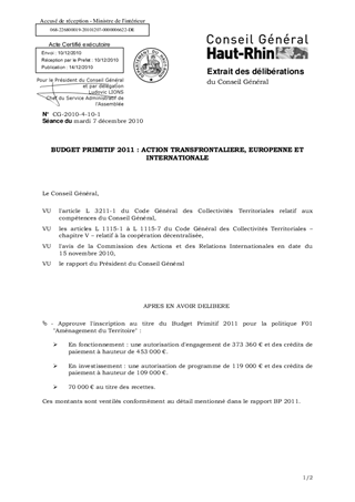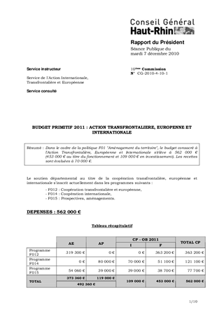 BUDGET PRIMITIF 2011 : ACTION TRANSFRONTALIERE, EUROPENNE ET INTERNATIONALE