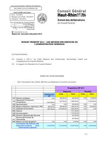 BUDGET PRIMITIF 2011 : LES MOYENS DES SERVICES DE L'ADMINISTRATION GENERALE