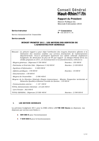 Le présent rapport a pour objet l'attribution des moyens financiers affectés à la réalisation des missions confiées aux services fonctionnels de l'administration départementale. Ceux-ci participent également aux efforts collectifs d'efficience budgétaire. En diminution de plus de 8% par rapport au Budget Primitif 2010, les crédits proposés en 2011, en investissement et en fonctionnement, s'élèvent à : - Moyens généraux : 8 708 000 € - Patrimoine et Droit des Sols : 4 162 000 € - Systèmes d'Information : 6 680 000 € - Affaires juridiques : 148 000 € - Documentation : 158 000 € - Moyens de l'Assemblée : 2 098 400 € -Moyens de la Direction Générale (Projets transversaux : Mission Prospective territoriale et Démarche Qualité) et Mission Contrôle de Gestion : 135 000 € - Communication externe : 1 137 000 € TOTAL Administration Générale :23 226 400 € - Livre Foncier : 362 000 € TOTAL GENERAL : 23 588 400 €