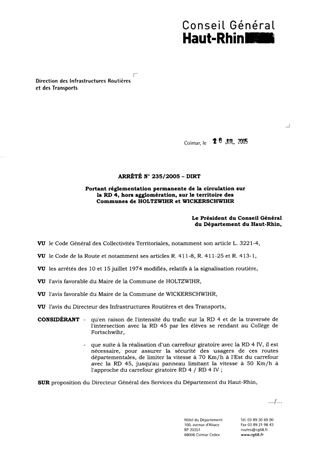 portant réglementation permanente de la circulation sur le RD 4, hors agglomération, sur le territoire des communes de HOLTZWIHR et WICKERSCHWIHR. Resumé Pièces jointes ARRETE Assemblée : Non défini Date : 26/07/2005 Rapporteur : Non défini Collectivité : Conseil départemental du Haut-Rhin Direction : Non défini Service : Direction des Routes Domaine : Circulation Commission :