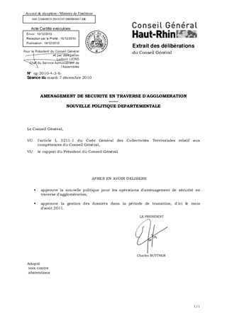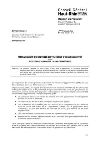 Le présent rapport a pour objet, d'une part d'approuver la nouvelle politique départementale en matière d'aménagement de sécurité en traverse d'agglomération et d'autre part, de définir la gestion des dossiers dans la période de transition d'ici le mois d'août 2011.
