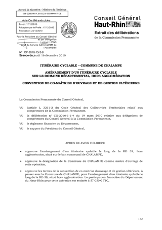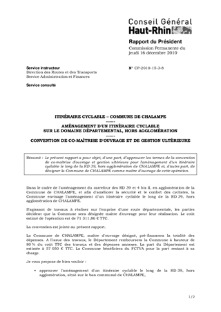 Le présent rapport a pour objet, d'une part, d’approuver les termes de la convention de co-maîtrise d'ouvrage et gestion ultérieure pour l'aménagement d'un itinéraire cyclable le long de la RD 39, hors agglomération de CHALAMPE et, d'autre part, de désigner la Commune de CHALAMPE comme maître d'ouvrage de cette opération.