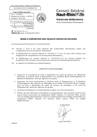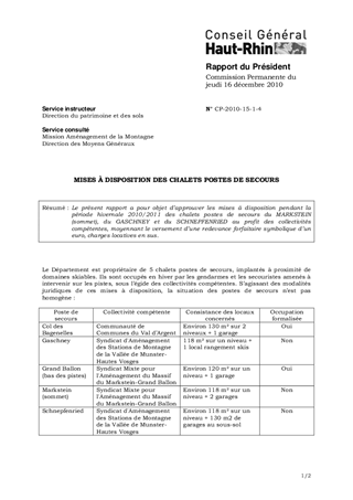 Le présent rapport a pour objet d’approuver les mises à disposition pendant la période hivernale 2010/2011 des chalets postes de secours du MARKSTEIN (sommet), du GASCHNEY et du SCHNEPFENRIED au profit des collectivités compétentes, moyennant le versement d’une redevance forfaitaire symbolique d’un euro, charges locatives en sus.