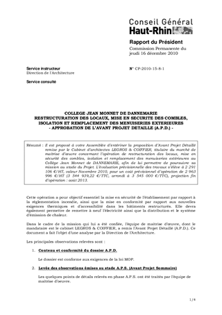 COLLEGE JEAN MONNET DE DANNEMARIE RESTRUCTURATION DES LOCAUX, MISE EN SECURITE DES COMBLES, ISOLATION ET REMPLACEMENT DES MENUISERIES EXTERIEURES - APPROBATION DE L’AVANT PROJET DETAILLE (A.P.D.) -