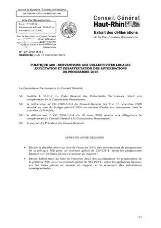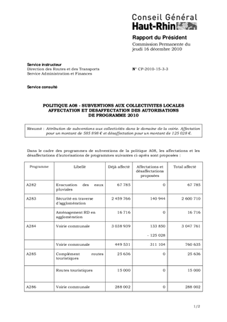 POLITIQUE A08 - SUBVENTIONS AUX COLLECTIVITES LOCALES AFFECTATION ET DESAFFECTATION DES AUTORISATIONS DE PROGRAMME 2010