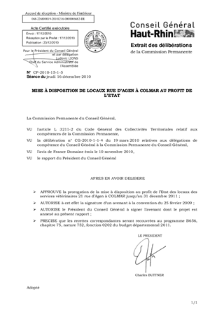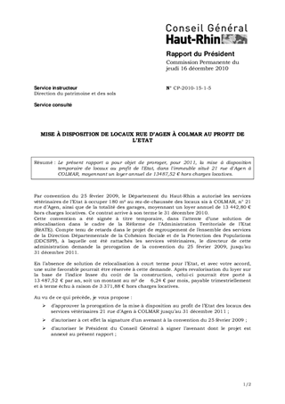 Le présent rapport a pour objet de proroger, pour 2011, la mise à disposition temporaire de locaux au profit de l'Etat, dans l'immeuble situé 21 rue d'Agen à COLMAR, moyennant un loyer annuel de 13487,52 € hors charges locatives.