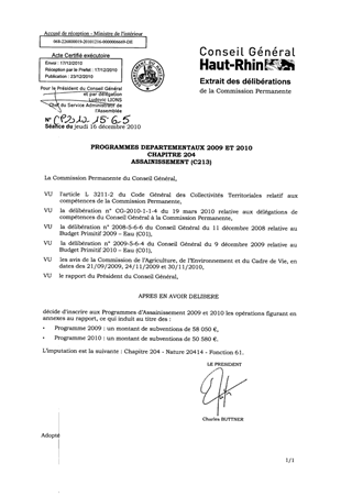 Après examen par la Commission de l'Agriculture, de l 'Environnement et du Cadre de Vie des dossiers présentés en 2009 et 2010, il vous est proposé de programmer les opérations dont l'ordre de service nous est parvenu et qui figurent en annexes au rapport, ce qui induit au titre des programmes : - 2009 : un montant global de subventions de 58 050 € pour l'Assainissement, - 2010 : un montant global de subventions de 50 580 € pour l'Assainissement.