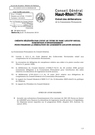 Le présent rapport a pour objet le versement d’une subvention de 400325€ à LOGIEST pour financer la démolition de 120 logements locatifs sociaux à VOLGELSHEIM.