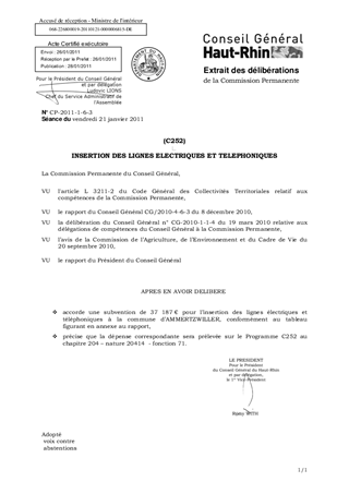 La commune d’AMMERTZWILLER a sollicité une aide financière départementale pour son projet d’insertion de lignes électriques et téléphoniques dans le secteur de l’Eglise. L’éligibilité de son dossier a été examinée lors de la réunion du 6 septembre 2010 de la commission de programmation de travaux puis validée le 20 septembre 2010 par la commission de l’Agriculture, de l’Environnement et du Cadre de vie. Conformément à la convention départementale de partenariat, signée le 20 décembre 2007 entre le Département du Haut-Rhin, EDF Distribution Alsace et France Télécom, le total de la subvention de la part du Département s’élèverait à 37.187 €, comme indiqué dans le tableau figurant en annexe.