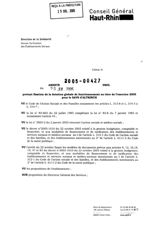 portant fixation de la dotation globale de fonctionnement au titre de l'exercice 2005 pour le SAVS d'ALTKIRCH. Resumé Pièces jointes ARRETE Assemblée : Non défini Date : 29/07/2005 Rapporteur : Non défini Collectivité : Conseil départemental du Haut-Rhin Direction : Non défini Service : Service de la Tarification des Etablissements Domaine : Dotations financières Commission :
