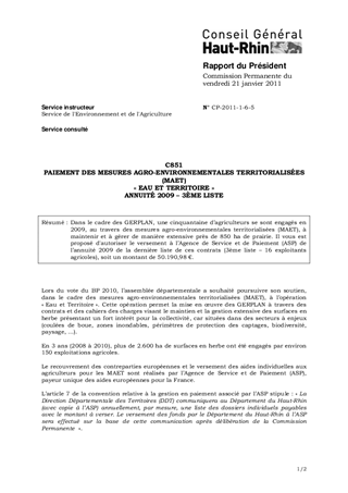 Dans le cadre des GERPLAN, une cinquantaine d’agriculteurs se sont engagés en 2009, au travers des mesures agro-environnementales territorialisées (MAET), à maintenir et à gérer de manière extensive près de 850 ha de prairie. Il vous est proposé d'autoriser le versement à l’Agence de Service et de Paiement (ASP) de l’annuité 2009 de la dernière liste de ces contrats (3ème liste – 16 exploitants agricoles), soit un montant de 50.190,98 €.