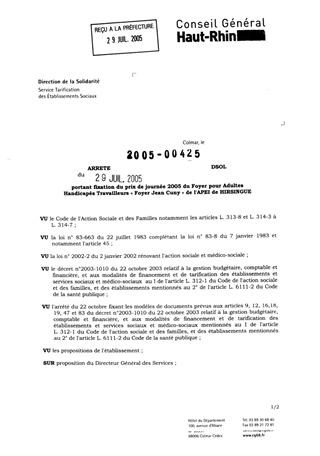 portant fixation du prix de journée 2005 du foyer pour adultes handicapés travailleurs "Foyer Jean Cuny" de l'APEI de HIRSINGUE. Resumé Pièces jointes ARRETE Assemblée : Non défini Date : 29/07/2005 Rapporteur : Non défini Collectivité : Conseil départemental du Haut-Rhin Direction : Non défini Service : Service de la Tarification des Etablissements Domaine : Prix de Journée Commission :