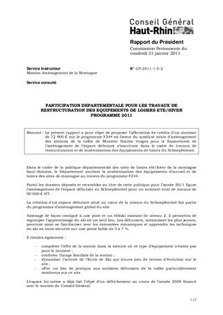 Le présent rapport a pour objet de proposer l’affectation de crédits d’un montant de 72 900 € sur le programme F244 en faveur du syndicat mixte d’aménagement des stations de la vallée de Munster Hautes Vosges pour le financement de l’aménagement de l’espace débutant s’inscrivant dans le cadre de travaux de restructuration et de modernisation des équipements de loisirs du Schnepfenried.