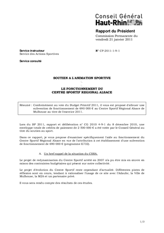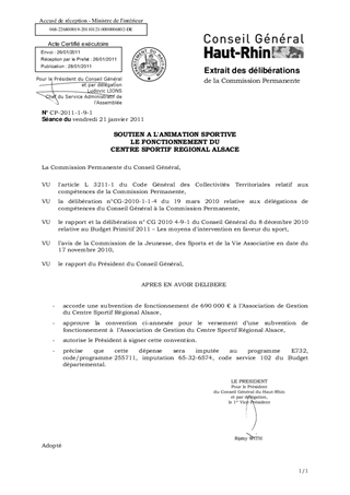 Conformément au vote du Budget Primitif 2011, il vous est proposé d'allouer une subvention de fonctionnement de 690 000 € au Centre Sportif Régional Alsace de Mulhouse au titre de l'exercice 2011.