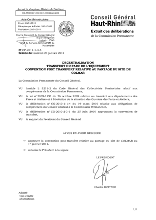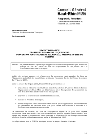 Le présent rapport a pour objet d'approuver la convention post-transfert relative au partage du site de Colmar du Parc de l'Equipement au 1er janvier 2011 et d'autoriser le Président à la signer.