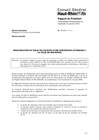 Le présent rapport a pour objet de prolonger le délai de validité d'une subvention accordée en juin 2008 à la Ville de MULHOUSE, d'un montant de 85 702 €, pour une durée de 18 mois à compter de la date prévisionnelle de déchéance triennale, soit jusqu'au 31 décembre 2012.