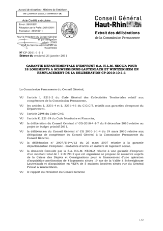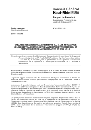 GARANTIE DEPARTEMENTALE D’EMPRUNT S.A. H.L.M. NEOLIA POUR 18 LOGEMENTS A SCHWEIGHOUSE-LAUTENBACH ET WINTZENHEIM EN REMPLACEMENT DE LA DELIBERATION CP-2010-10-1-1