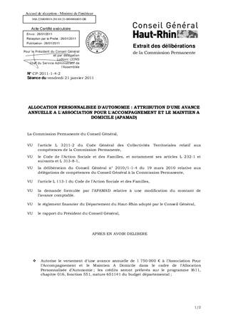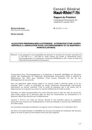 Il est proposé à votre assemblée de diminuer le montant de l'avance annuelle de 2 150 000 € à 1 750 000 €. Cette avance est versée à l'Association Pour l'Accompagnement et le Maintien A Domicile (APAMAD) en 2011 dans le cadre de l'Allocation personnnalisée d'Autonomie.