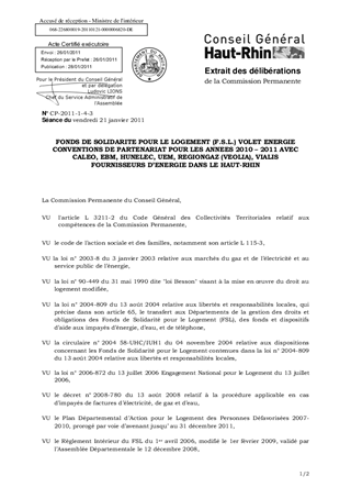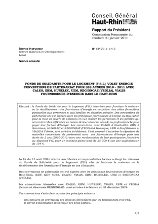 FONDS DE SOLIDARITE POUR LE LOGEMENT (F.S.L.) VOLET ENERGIE CONVENTIONS DE PARTENARIAT POUR LES ANNEES 2010 – 2011 AVEC CALEO, EBM, HUNELEC, UEM, REGIONGAZ (VEOLIA), VIALIS FOURNISSEURS D’ENERGIE DANS LE HAUT-RHIN