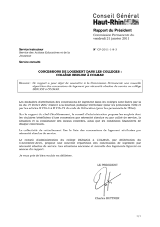 Ce rapport a pour objet de soumettre à la Commission Permanente une nouvelle répartition des concessions de logement par nécessité absolue de service au collège BERLIOZ à COLMAR.