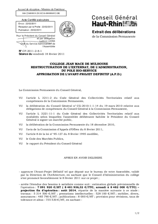 Il est proposé à votre Assemblée d’entériner les études d’Avant-Projet Définitif remises par le cabinet d’architectes MULLER & MULLER, titulaire du marché de maîtrise d’œuvre concernant l’opération de restructuration de l’externat, de l’administration, du pôle Bio-Service au collège Jean Macé, à MULHOUSE, afin de lui permettre de poursuivre sa mission au stade du Projet. L’évaluation prévisionnelle des travaux s’élève à 5 314 500 €/HT, dont 287 700 €/HT de travaux complémentaires, valeur octobre 2010. Le montant prévisionnel de cette opération est estimé à 8 482 000 €/TTC, valeur fin d’opération, août 2014.