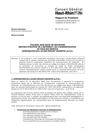 COLLEGE JEAN MACE DE MULHOUSE RESTRUCTURATION DE L’EXTERNAT, DE L’ADMINISTRATION, DU POLE BIO-SERVICE APPROBATION DE L’AVANT-PROJET DEFINITIF (A.P.D.)