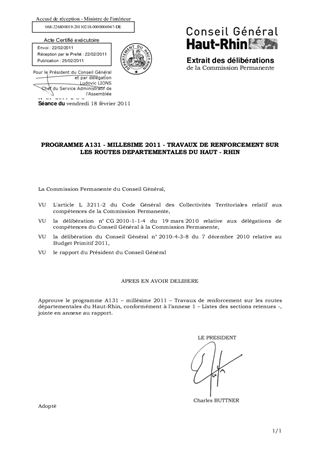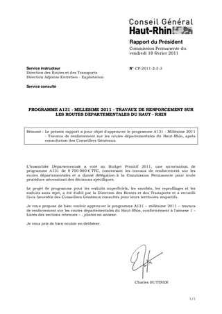 Le présent rapport a pour objet d'approuver le programme A131 - Millésime 2011 - Travaux de renforcement sur les routes départementales du Haut-Rhin, après consultation des Conseillers Généraux.