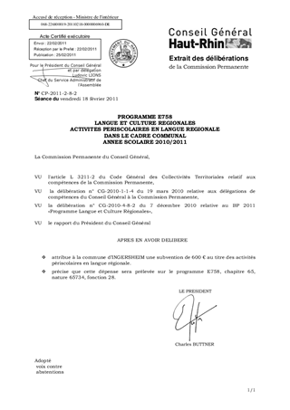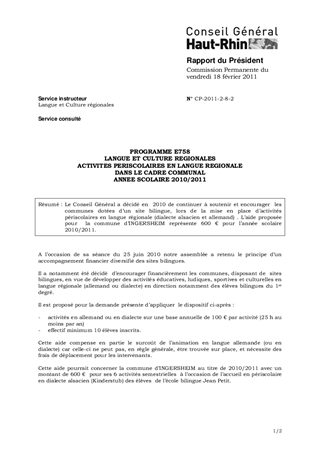 Le Conseil Général a décidé en 2010 de continuer à soutenir et encourager les communes dotées d’un site bilingue, lors de la mise en place d’activités périscolaires en langue régionale (dialecte alsacien et allemand) . L’aide proposée pour la commune d’INGERSHEIM représente 600 € pour l’année scolaire 2010/2011.
