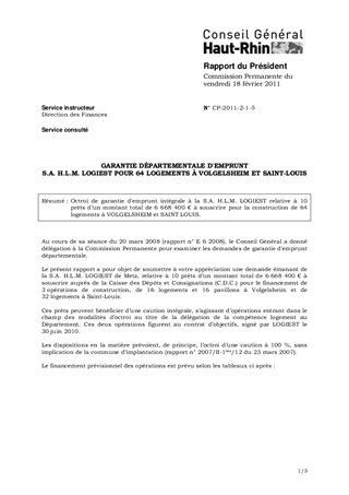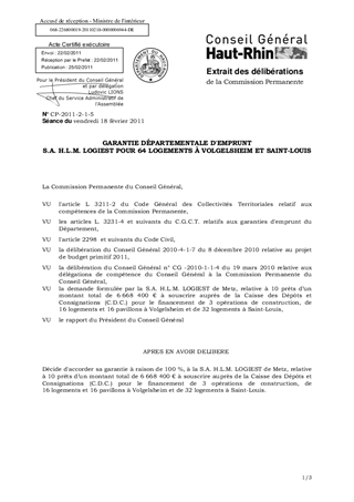 GARANTIE DÉPARTEMENTALE D'EMPRUNT S.A. H.L.M. LOGIEST POUR 64 LOGEMENTS À VOLGELSHEIM ET SAINT-LOUIS