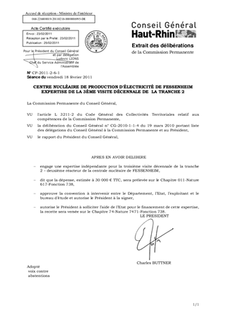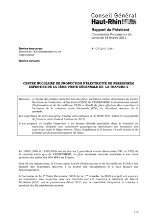 A l'instar des études réalisées lors des deux premières visites décennales du Centre Nucléaire de Production d'Electricité (CNPE) de FESSENHEIM, la Commission Locale d'Information et de Surveillance (CLIS) a décidé de faire effectuer des expertises à l'occasion de la troisième visite décennale (VD3) du deuxième réacteur de la centrale. Les expertises de cette deuxième tranche sont estimées à 30 000€ TTC ; l'Etat est susceptible de financer cette étude à hauteur de 50 %. Il est proposé de confier l'expertise à un bureau d'étude spécialisé dans le domaine du nucléaire, d'établir une convention quadripartite définissant les modalités des expertises entre le Département, l'Etat, l'exploitant et le bureau d'étude retenu et de solliciter un financement auprès de l'Etat.