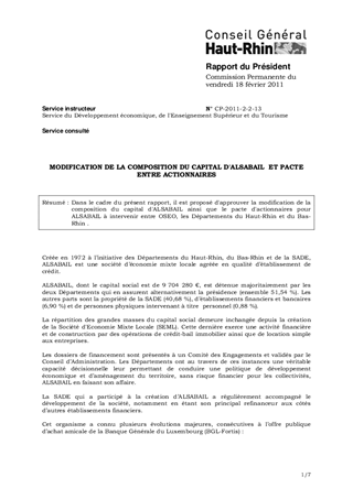 Dans le cadre du présent rapport, il est proposé d'approuver la modification de la composition du capital d'ALSABAIL ainsi que le pacte d'actionnaires pour ALSABAIL à intervenir entre OSEO, les Départements du Haut-Rhin et du Bas-Rhin .