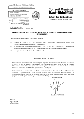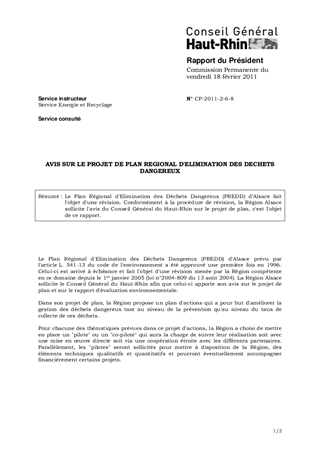 Le Plan Régional d'Elimination des Déchets Dangereux (PREDD) d'Alsace fait l'objet d'une révision. Conformément à la procédure de révision, la Région Alsace sollicite l'avis du Conseil Général du Haut-Rhin sur le projet de plan, c'est l'objet de ce rapport.
