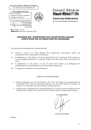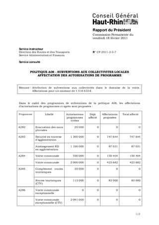 POLITIQUE A08 - SUBVENTIONS AUX COLLECTIVITES LOCALES AFFECTATION DES AUTORISATIONS DE PROGRAMME