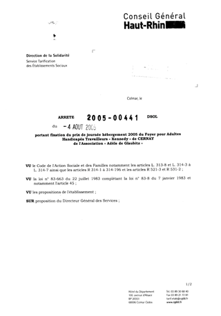 portant fixation du prix de journée hébergement 2005 du foyer pour adultes handicapés travailleurs "Kennedy" de CERNAY de l'Association "Adèle de Glaubitz". Resumé Pièces jointes ARRETE Assemblée : Non défini Date : 04/08/2005 Rapporteur : Non défini Collectivité : Conseil départemental du Haut-Rhin Direction : Non défini Service : Service de la Tarification des Etablissements Domaine : Prix de Journée Commission :