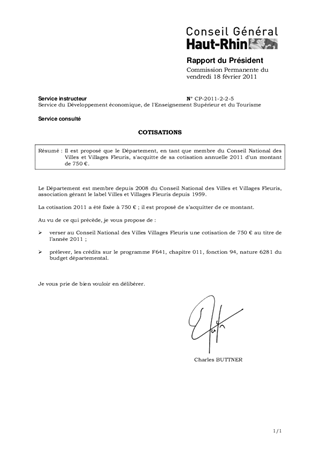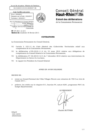 Il est proposé que le Département, en tant que membre du Conseil National des Villes et Villages Fleuris, s'acquitte de sa cotisation annuelle 2011 d'un montant de 750 €.