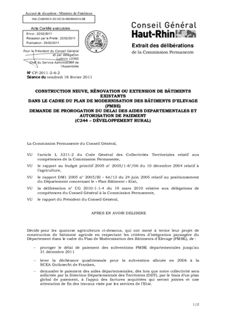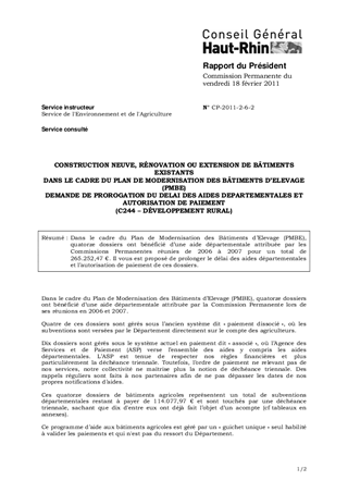 CONSTRUCTION NEUVE, RÉNOVATION OU EXTENSION DE BÂTIMENTS EXISTANTS DANS LE CADRE DU PLAN DE MODERNISATION DES BÂTIMENTS D’ELEVAGE (PMBE) DEMANDE DE PROROGATION DU DELAI DES AIDES DEPARTEMENTALES ET AUTORISATION DE PAIEMENT (C244 – DÉVELOPPEMENT RURAL)